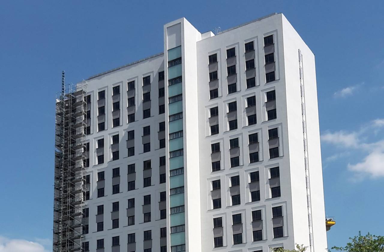 Es wurde ein zusätzliches Treppenhaus am Hochhaus über 18 Etagen in Stahlbeton vorgebaut.